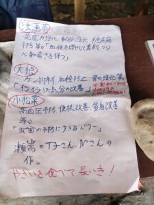 写真は私がいただいた分。葉つきの大根、小松菜一株、ホウレンソウ二株。野菜効能を説明したメモ書きが添えられていた。至れり尽くせりだ。