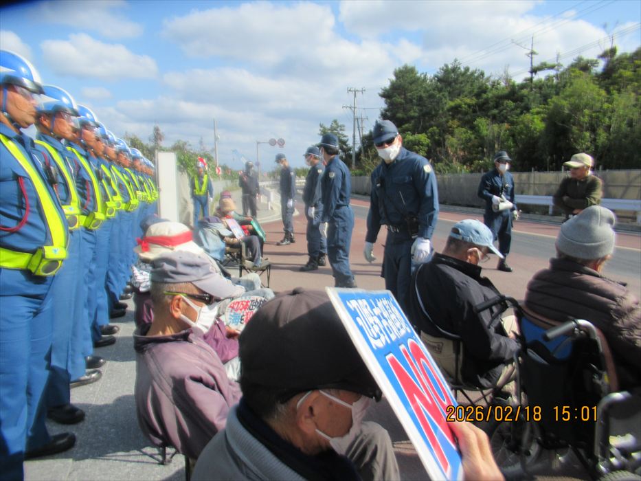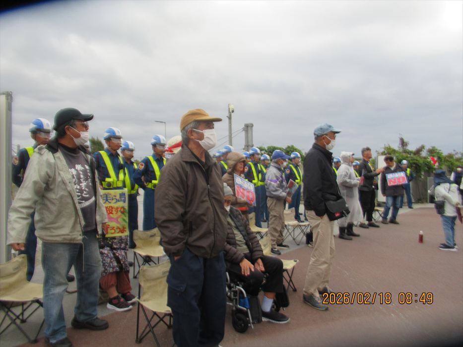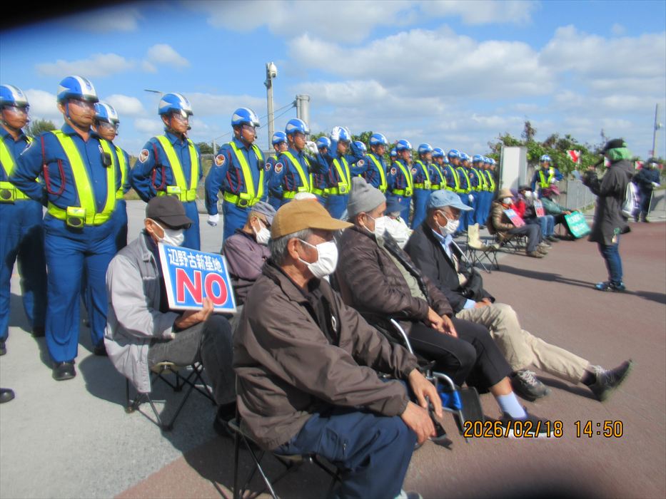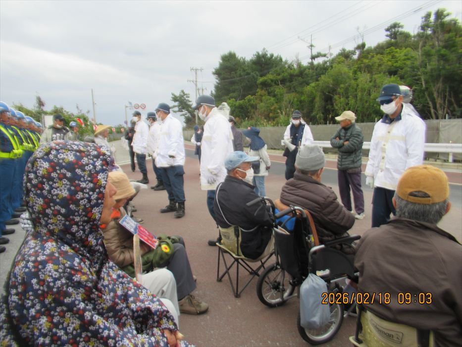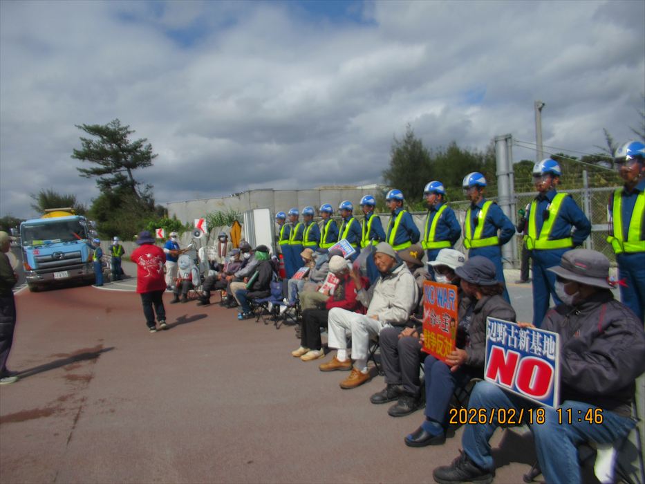 今月初めから、高速道路の工事に伴う渋滞があり、那覇出発を15分早めているが、今日も座り込み現場の現場である工事用ゲートまでバスで直行、何とか10分前には到着することができた。すでに数人が座り込んで、ゲートを守っていてくれた。