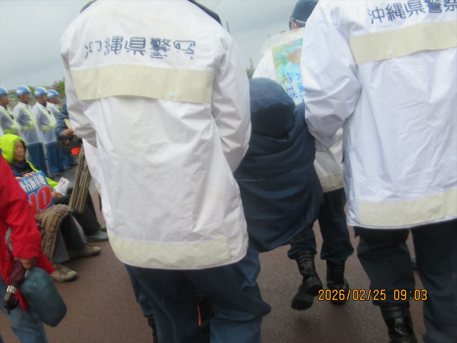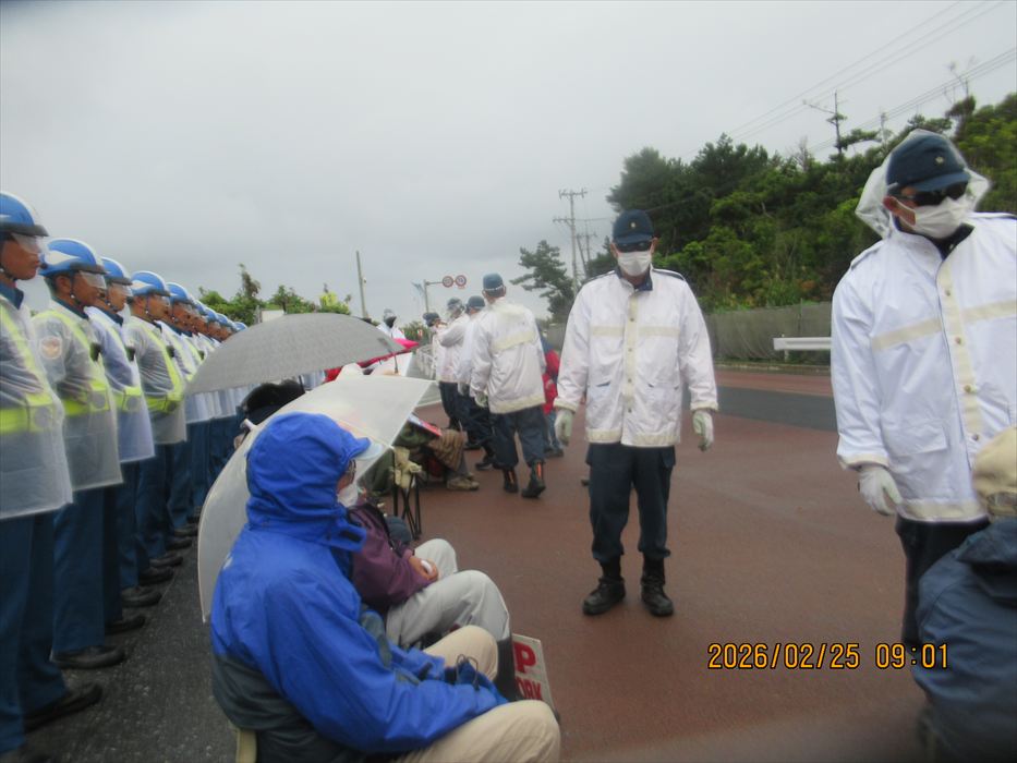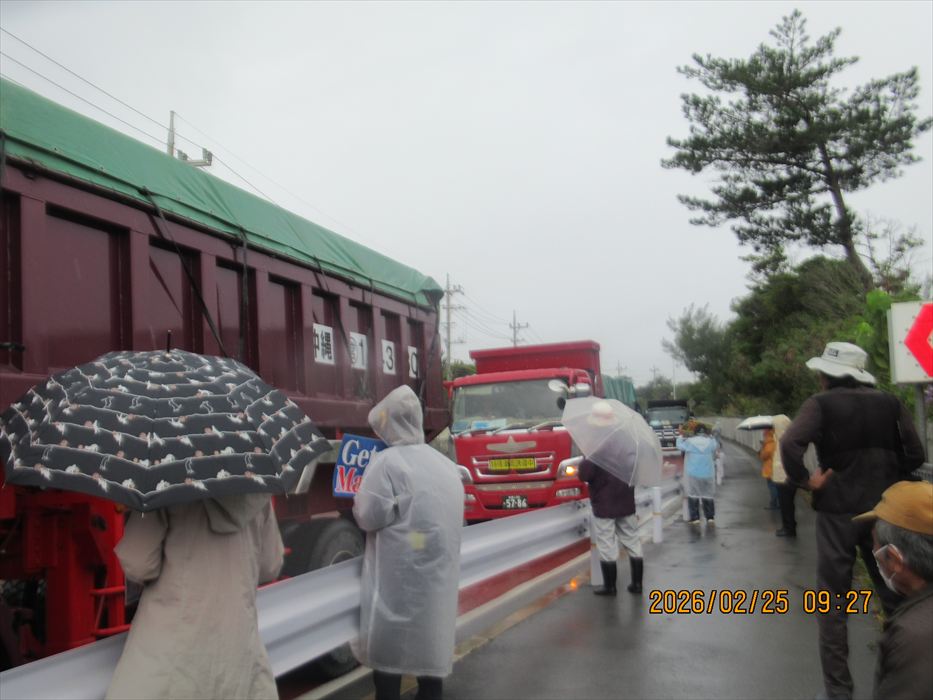 25日(水)の辺野古行き、高速道路の渋滞は相変わらず。この日は朝からの雨でさらに渋滞が激しくなり、ゲート前に到着し座り込んだのは9時の直前、何とか間に合ったものの、ミキサー車やダンプがすでに列を成していた。