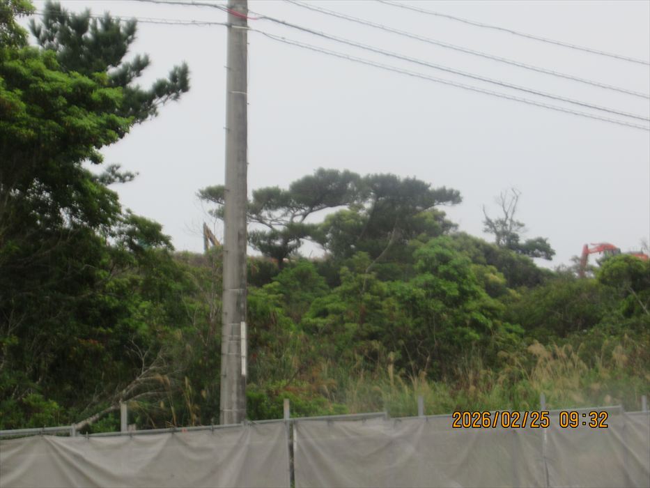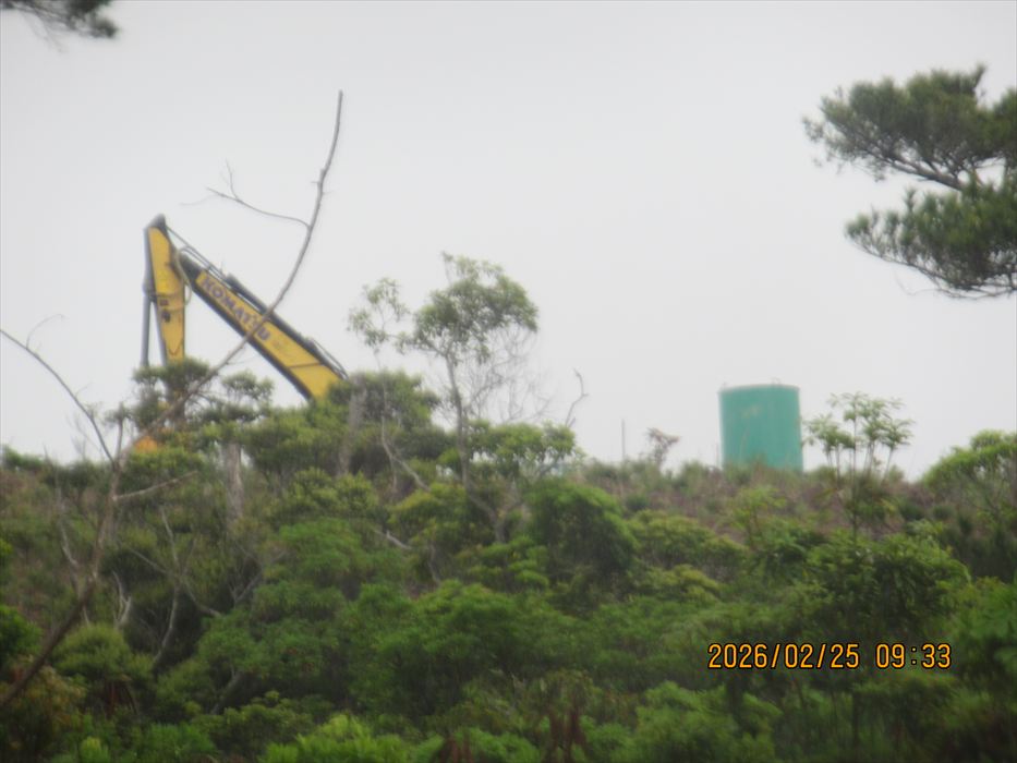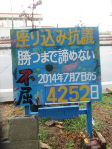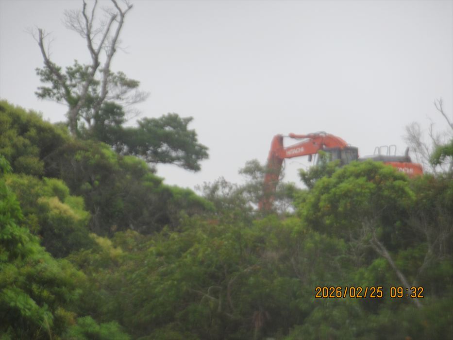 周辺の山々が削りとられ、赤土をさらす中、工事用ゲートの真向いの山は、一見緑が茂っているように見えるが、よく見るとその緑のすぐ後ろで重機が何台も動き回っている。手前の緑を屏風よろしく目隠しにして、たとえ一時でも座り込む市民らの目をそらそうとの魂胆か。