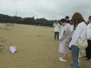 関西から訪れた11人のメンバーは、一回目の座り込みの後、辺野古浜で、花をささげて冥福を祈った。