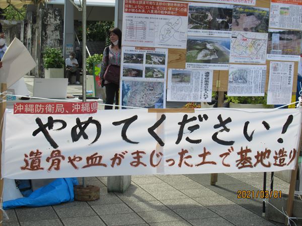 魂魄の塔近くの熊野鉱山は、その名の示す通り和歌山県にある企業。辺野古利権にあやかろうとする県外企業だ。沖縄は再び殺されてはならない。辺野古の海を埋める土砂のすべてを宮古、八重山を含めて沖縄全土から調達、その60%を南部地域から採掘するという。沖縄の山野の地形を変えるほどに破壊してまで、辺野古基地を造らないといけないのか!沖縄は、また、殺される!うちなぁ、殺さってーないびらんどー!」