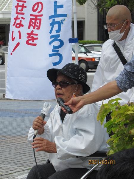 「県民よ 立ち上がろう。二度と血の雨を降らさせない!」島袋文子さんの車いすに立てられているのぼり。