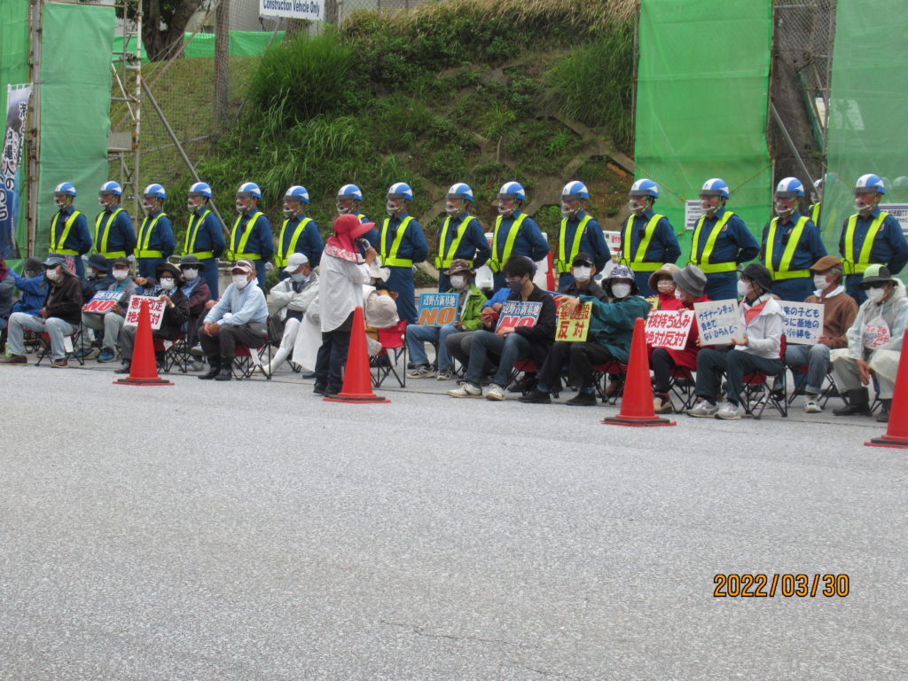 途中、交通事故の渋滞に巻き込まれ、辺野古へ着いたのは9時03分。ゲート前ではすでに一回目座り込んだ人たちの排除が始まっていた。
