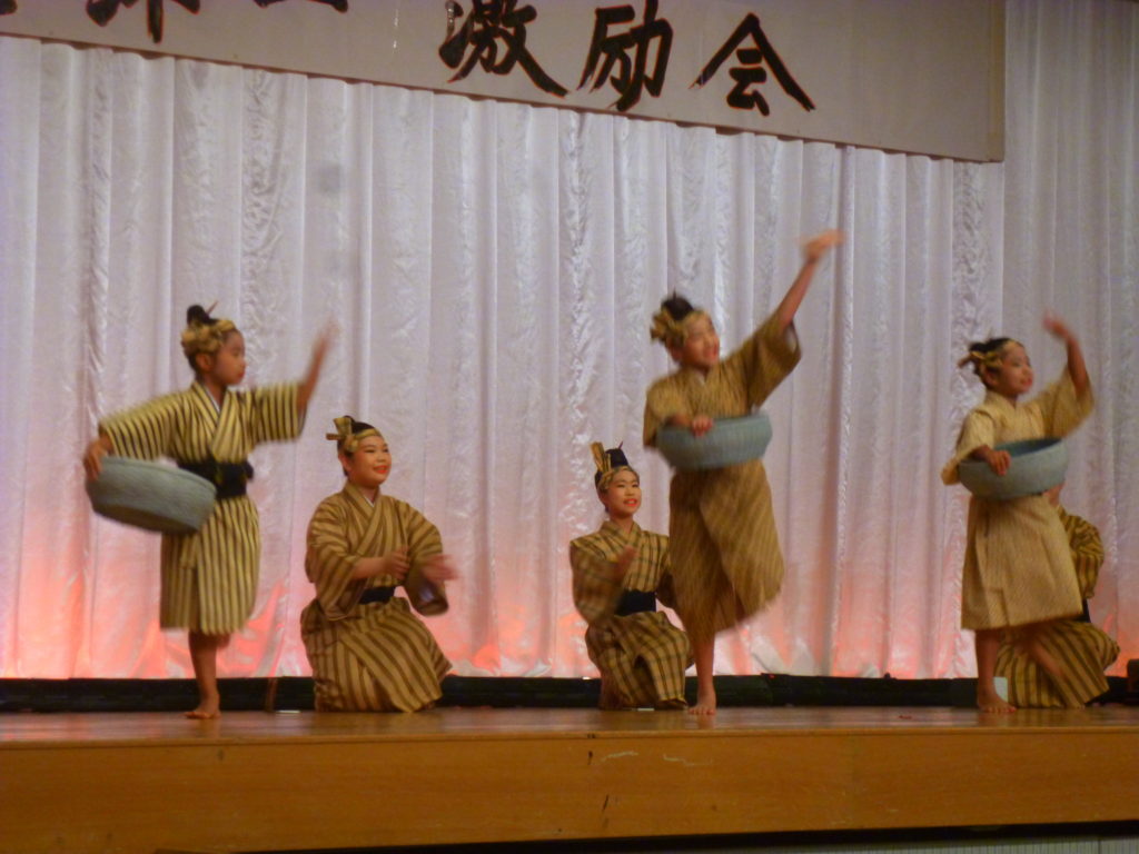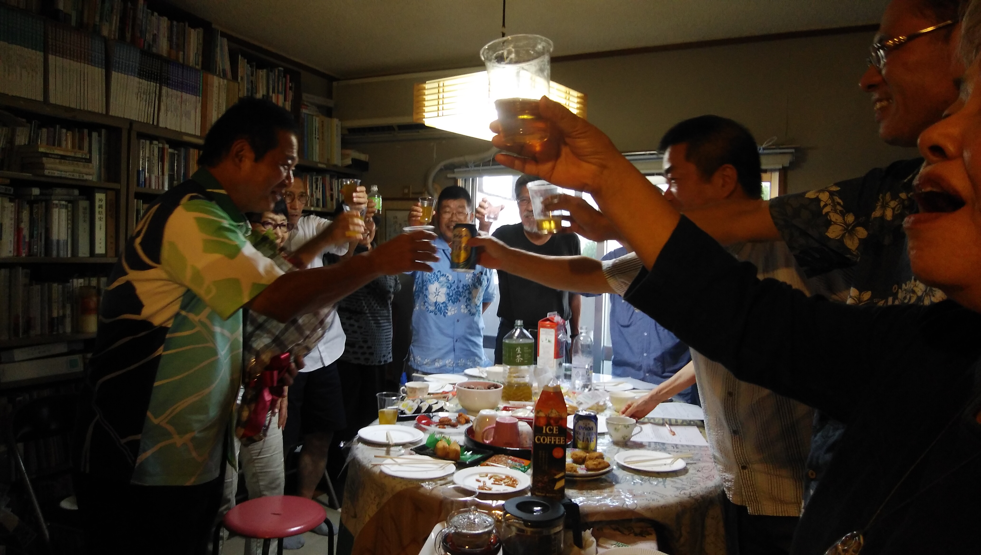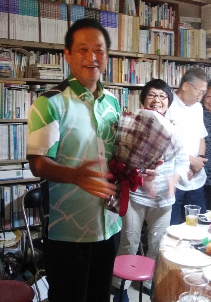 友人たちから激励の花束を受ける「ひが京子」さん。