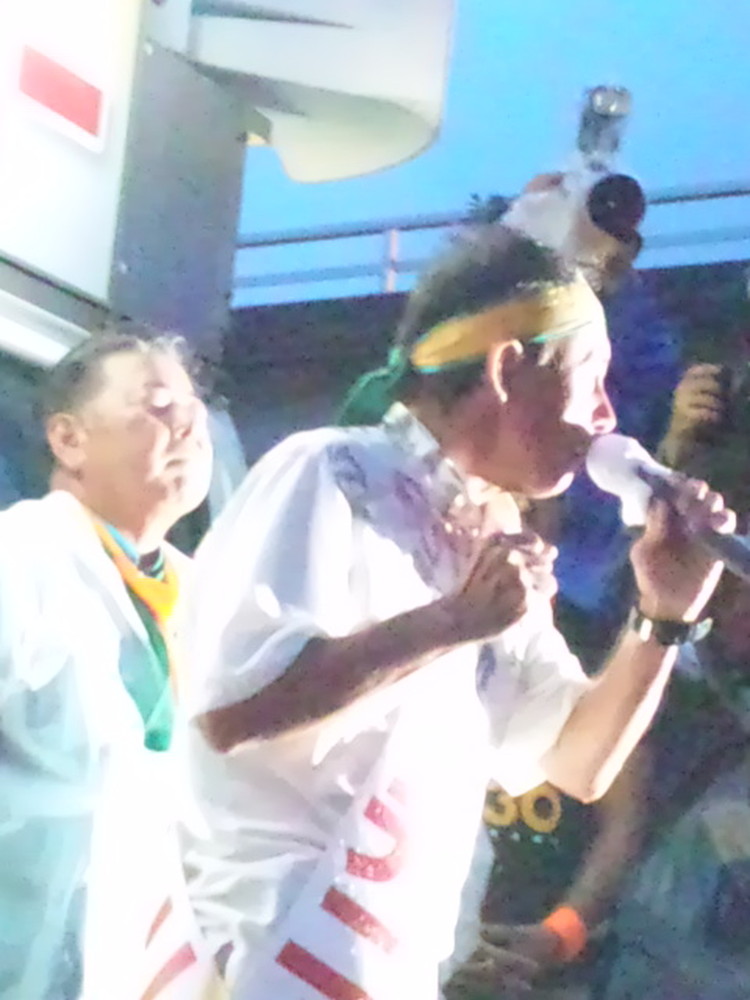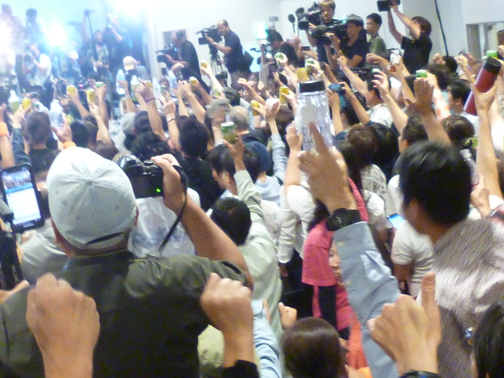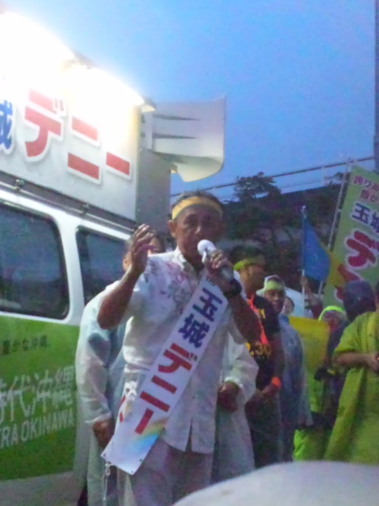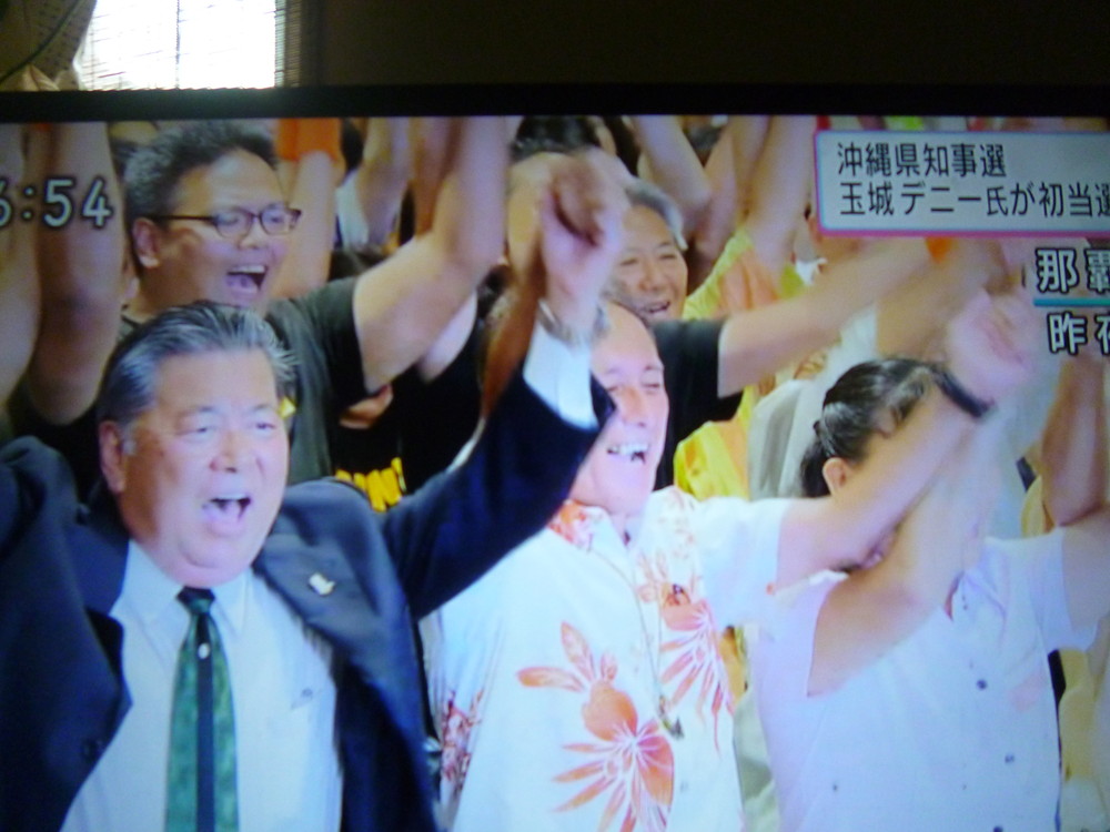後方にいた私のほうからはデニーさんの様子は見えなかったが、会場が拍手と完成で沸き上がり、翌日のニュースで、この場面で万歳の後、デニーさんを中心に選対本部の重鎮たちが、カチャーシーを踊ったようだ。