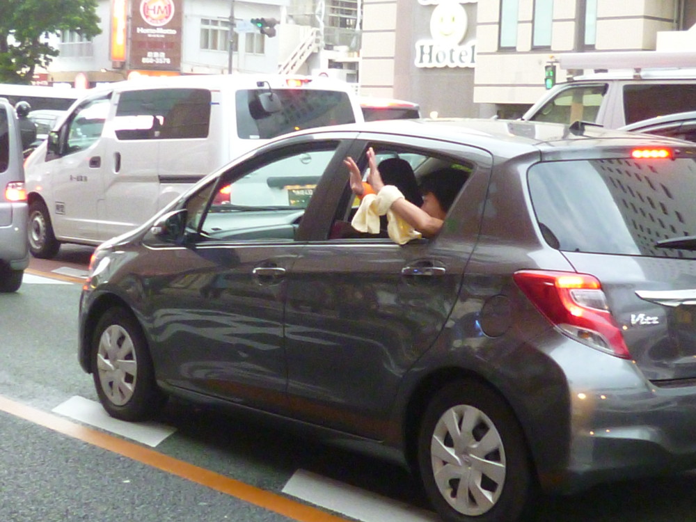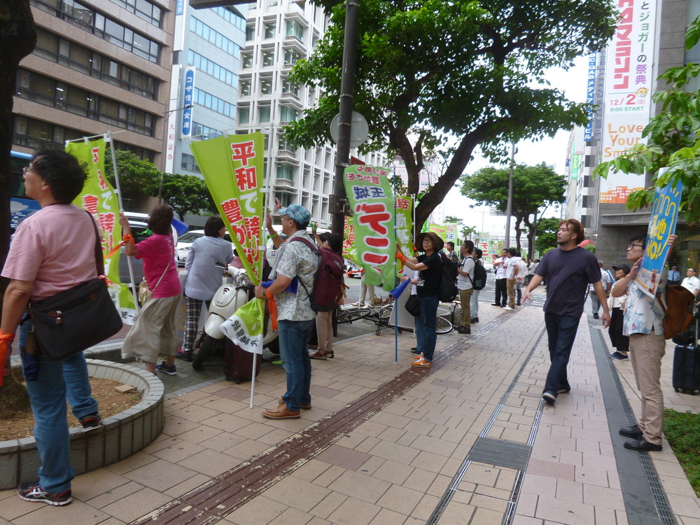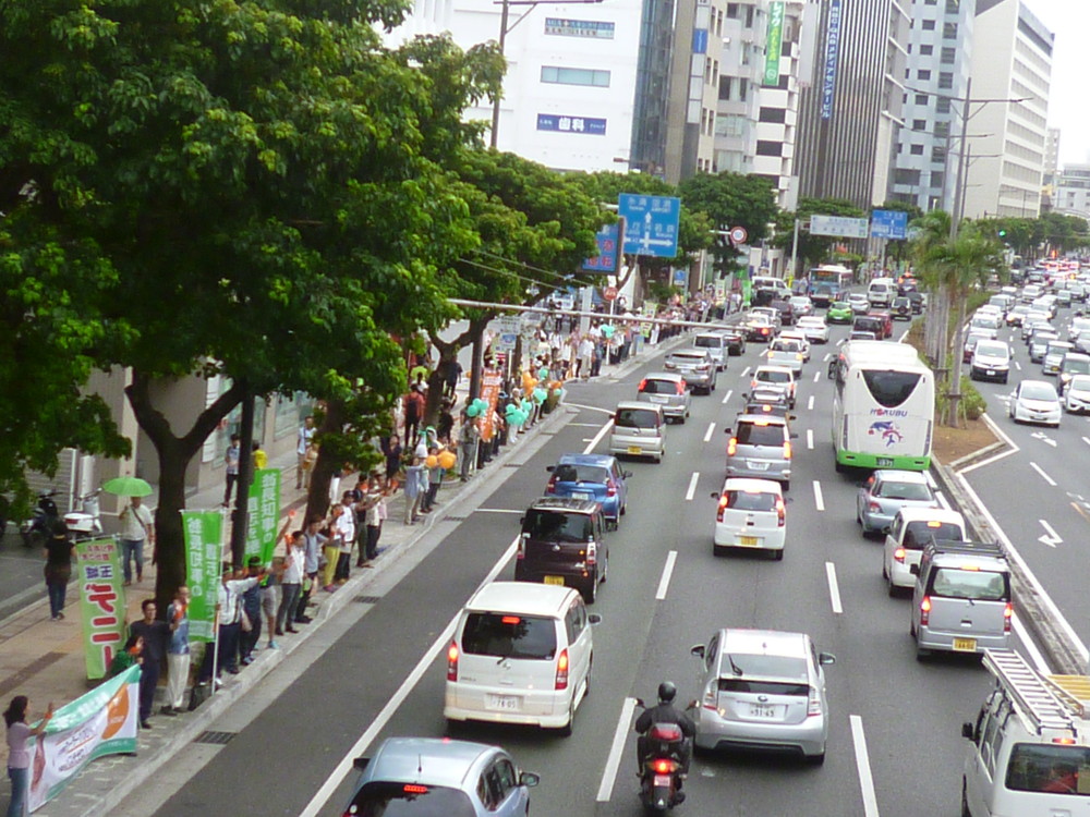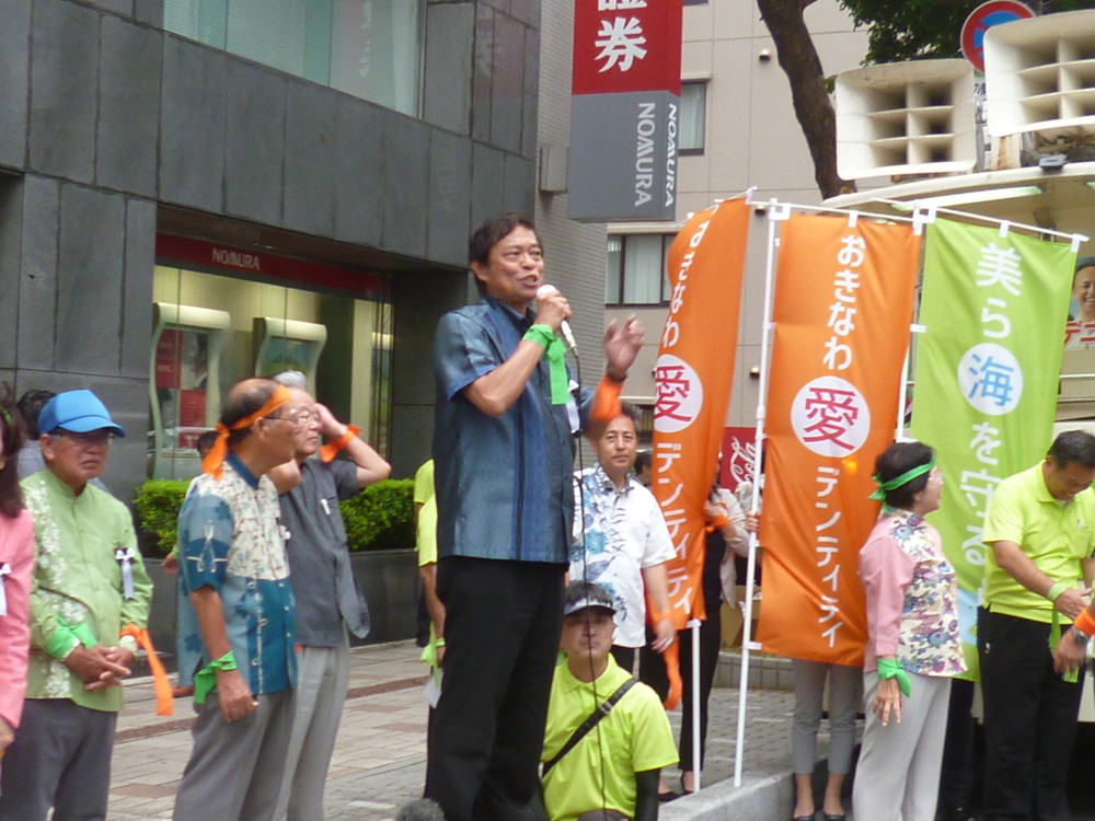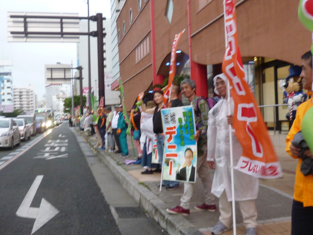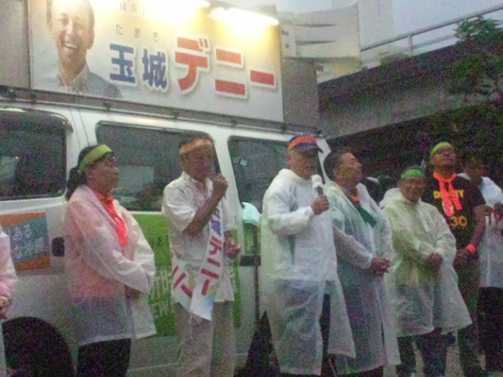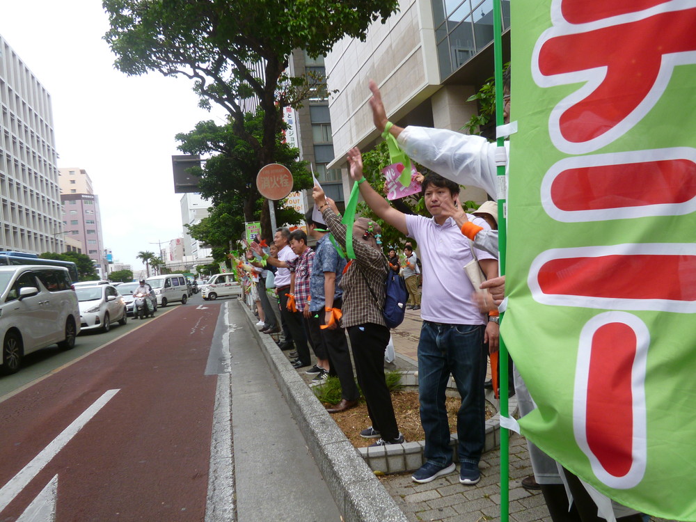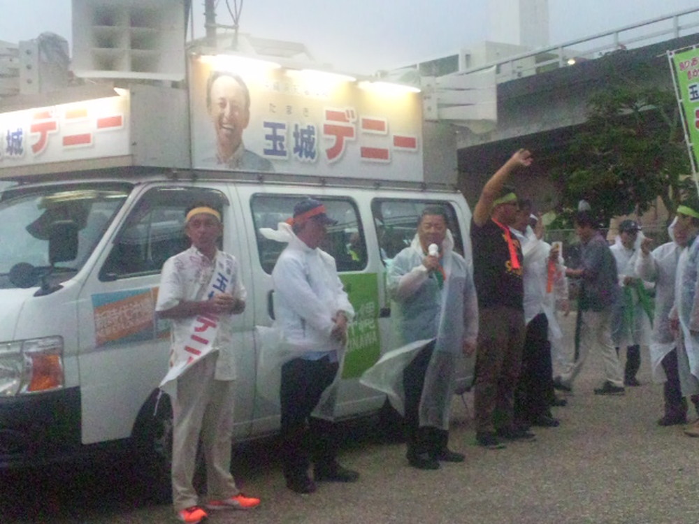 一通りメディア対応が終わった後、デニーさんは後援会長の呉屋さんとともに後ろを振り向き、支持者に向かって深々と頭を下げ、次に高々とこぶしを突き上げた。