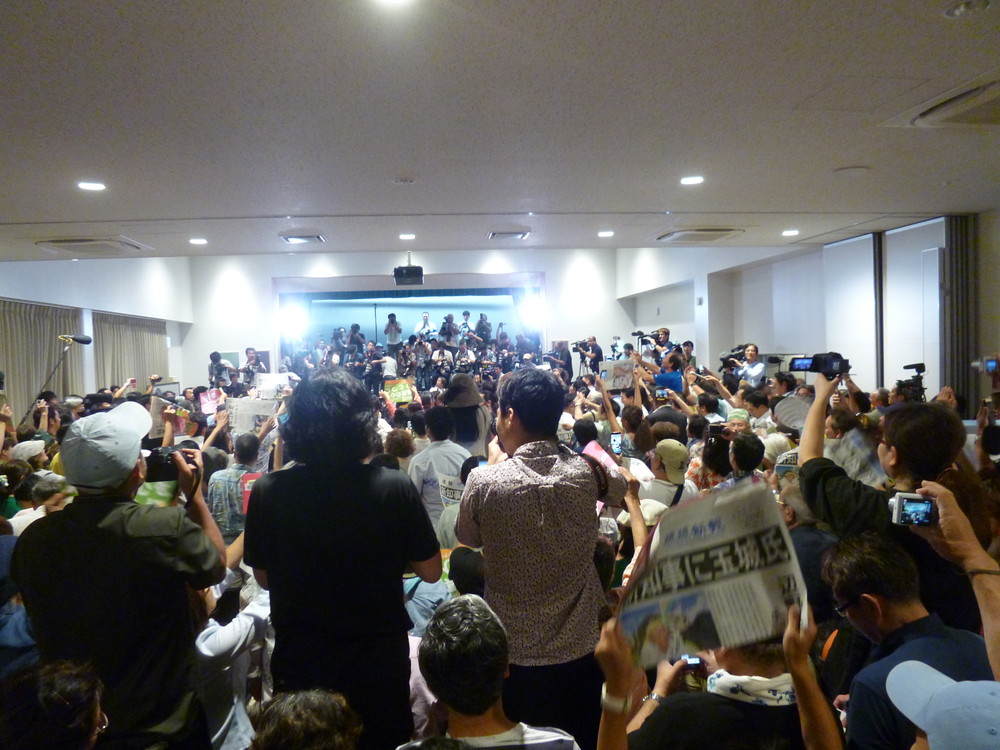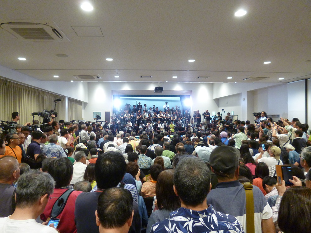 30日午後8時過ぎ、開票を見守る玉城候補と支持者たち。接戦で結果が判明するのは深夜とみられていたが、8時過ぎには朝日新聞がネット版で早々と当確を出し、慌てて集まってきた支持者で、会場の教育福地会館のホールはいっぱいになった。