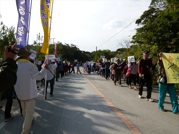 先回りした機動隊が、メインゲート前で、民間のバスまで利用して県道を封鎖したことに抗議。