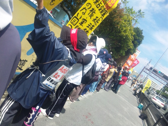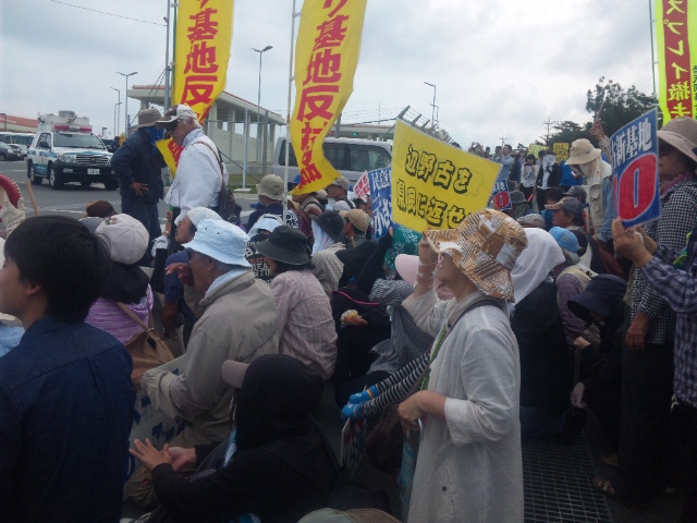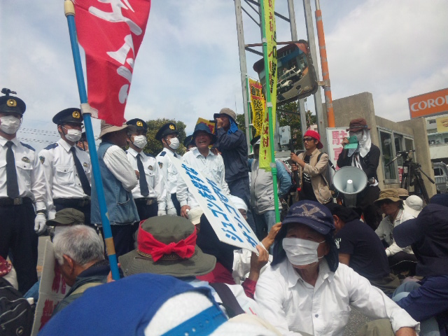 ゲート前でいつものようにデモ行進、座り込みをしようとした市民を二か所に分断して