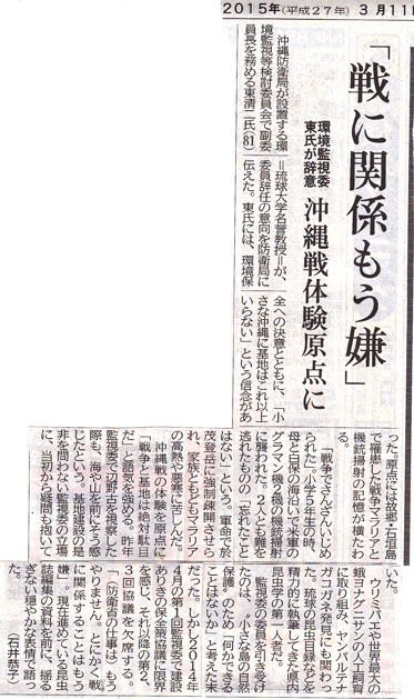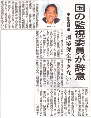 一方、沖縄・生物多様性市民ネットワークなど10団体も17日、東氏の辞意を支持し監視委の在り方を追及する会見を県庁で開く予定。<琉球新報 3月17日>