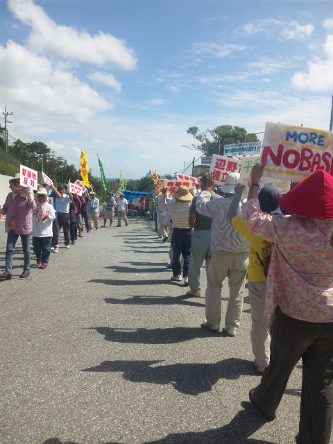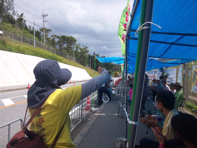 今日、ゲート前には、日中およそ200人がかけつけ、いつものテントの下ではなく、ゲートを封鎖した形で終日座り込んで集会を開いた。
