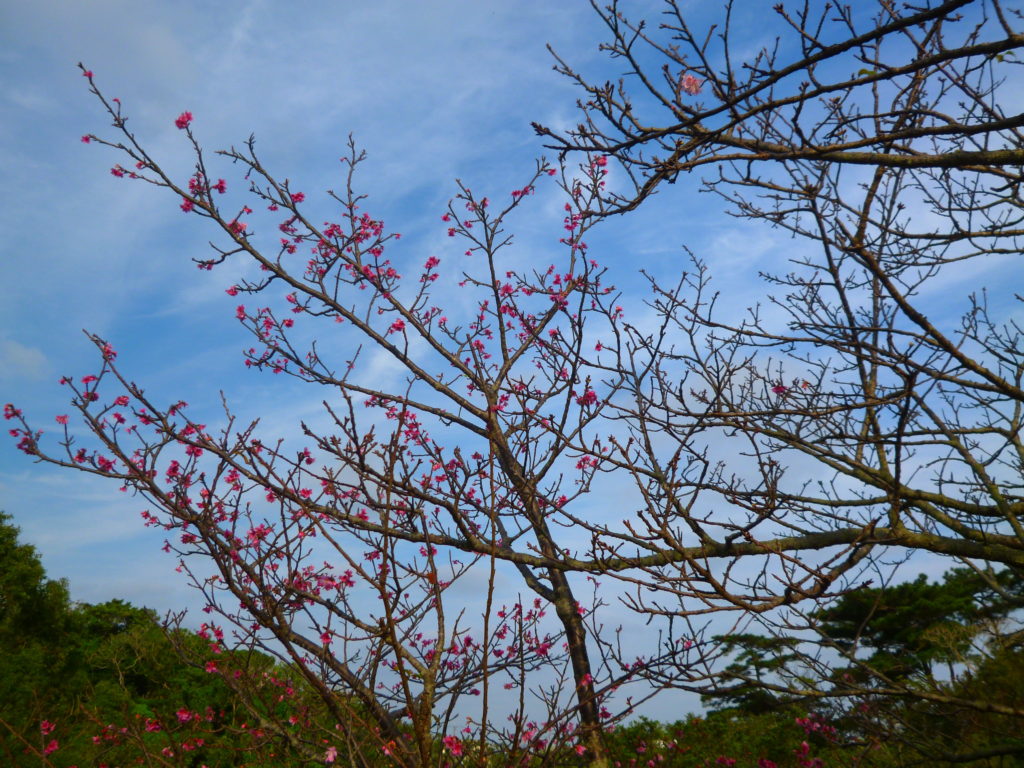 桜は桜でも、沖縄の桜はソメイヨシノではなくヒカンザクラ(寒緋桜ともいう)という種類です。青空に目が覚めるような緋色で心を緩め身体を温めて、悪いイメージを吹き飛ばしていただけたらと思います。