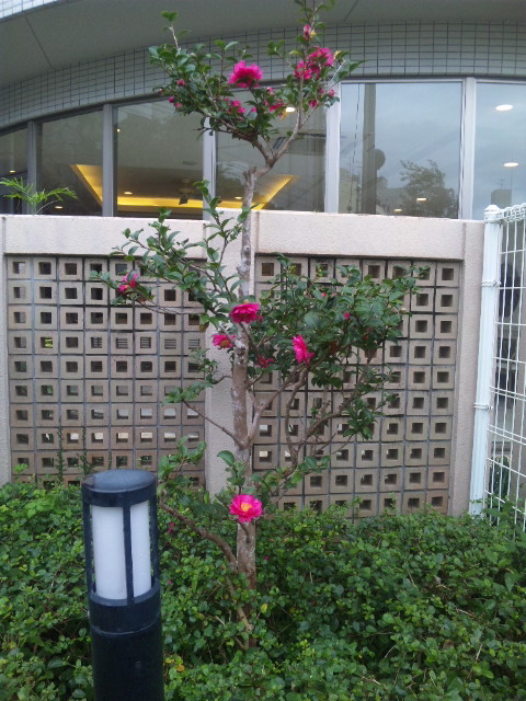最近、那覇市牧志のとあるマンションの生垣に、紅白のツバキを見つけました。