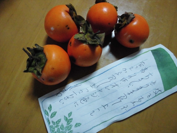 「皮を剝かず、そのまま召し上がってください。青いものはオレンジ色になってから…」としたためられた一筆箋。比べると柿の大きさが分かりますね。
