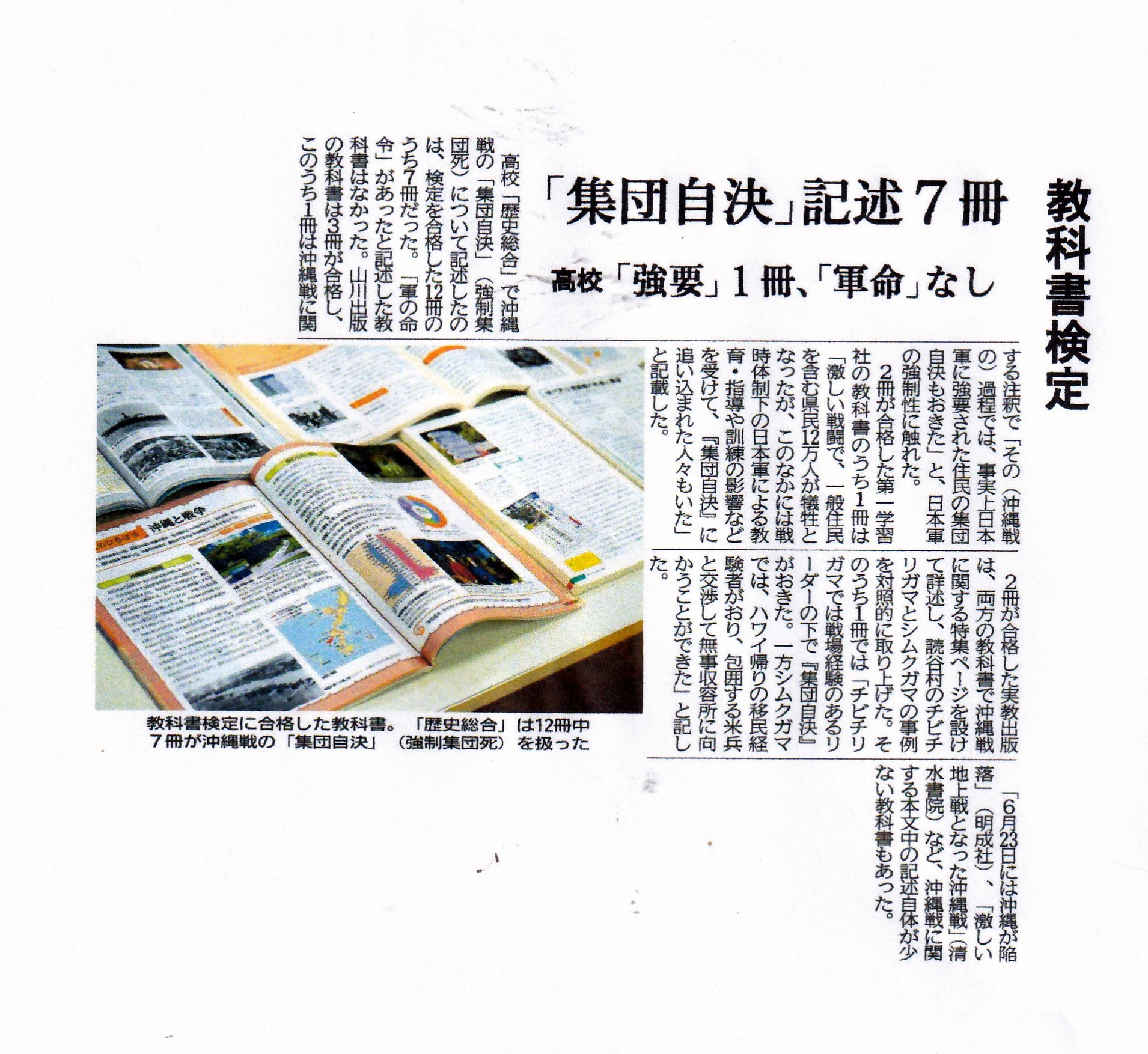 来年度から使用する教科書の検定結果が発表され、12社中5社の教科書から『集団自決』が消え、学徒の慰霊碑を『顕彰碑』と誤記、「戦争を美化する記述」と、関係者が抗議声明を出すなど、教科書検定で「沖縄」に関する記述でいくつかの問題点が明らかになった。