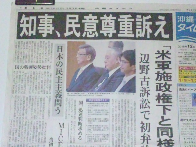 「沖縄、そして日本の未来を切り開く判断を!」~代執行訴訟意見陳述で翁長知事 国が翁長知事を相手に起こした代執行訴訟の第一回口頭弁論が、 昨日(2日)開かれ、翁長知事が意見陳述を行った。 <3日、沖縄タイムス> <3日 沖縄タイムス> 「日本には本当に地方自治や民主主義が存在するのか」「沖縄にのみ負担を強いる今の日米安保体制は正常と言えるのか」との翁長知事の問いかけに、原告席に座る国側の関係者は、知事に目を向けるでもなく、無表情で聞いていたと、地元メディアは伝えている。 東京でも永田町の首相官邸前で、750人が集まり支援集会が開かれたという。 知事の意見陳述を伝える地元メディア(新報、タイムス) 2015年12月3日unaiリンクURL