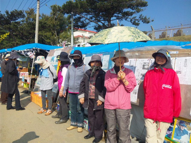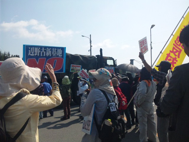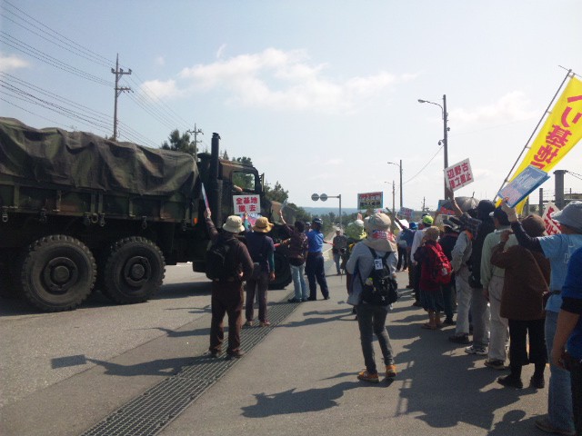 抗議の市民が、一時ゲートを封鎖して基地から出てくる軍車両を止めたため