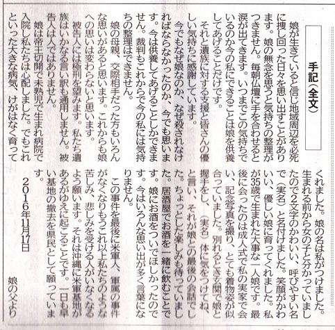 元海兵隊員による強姦殺人事件から半年がたった昨日、被害者の父親の手記が新聞に掲載された。