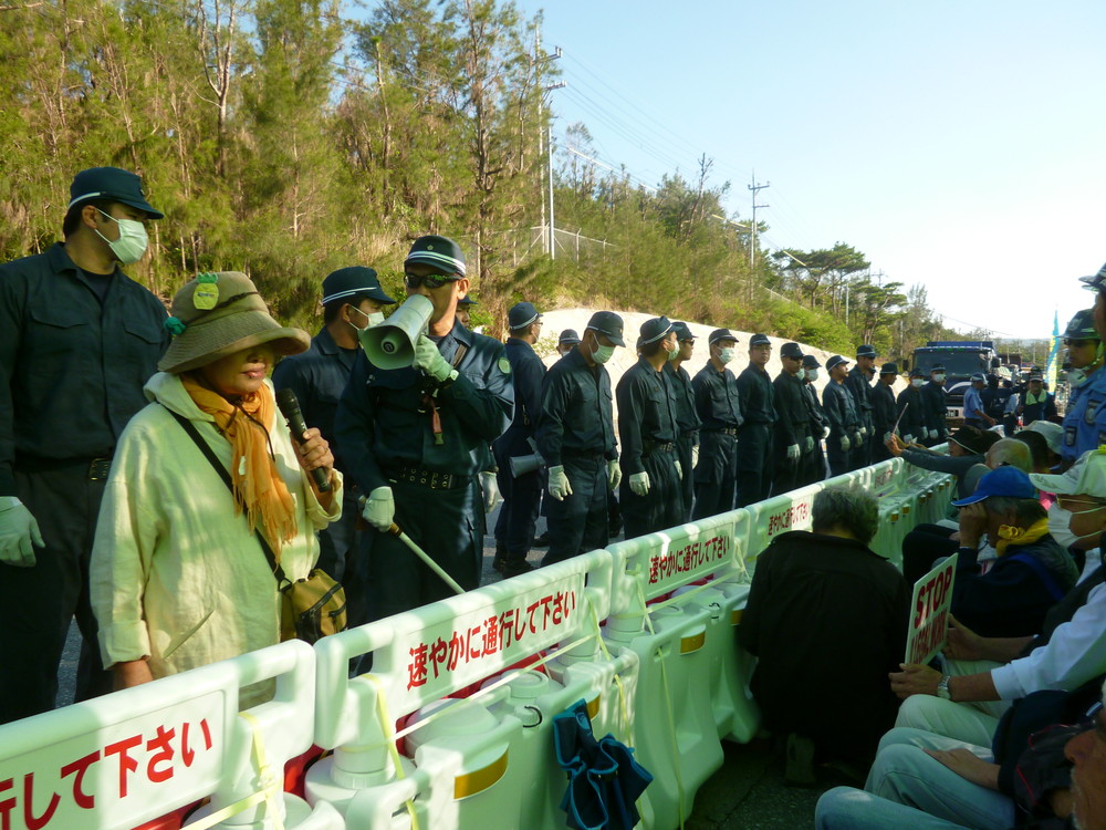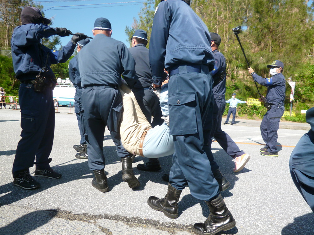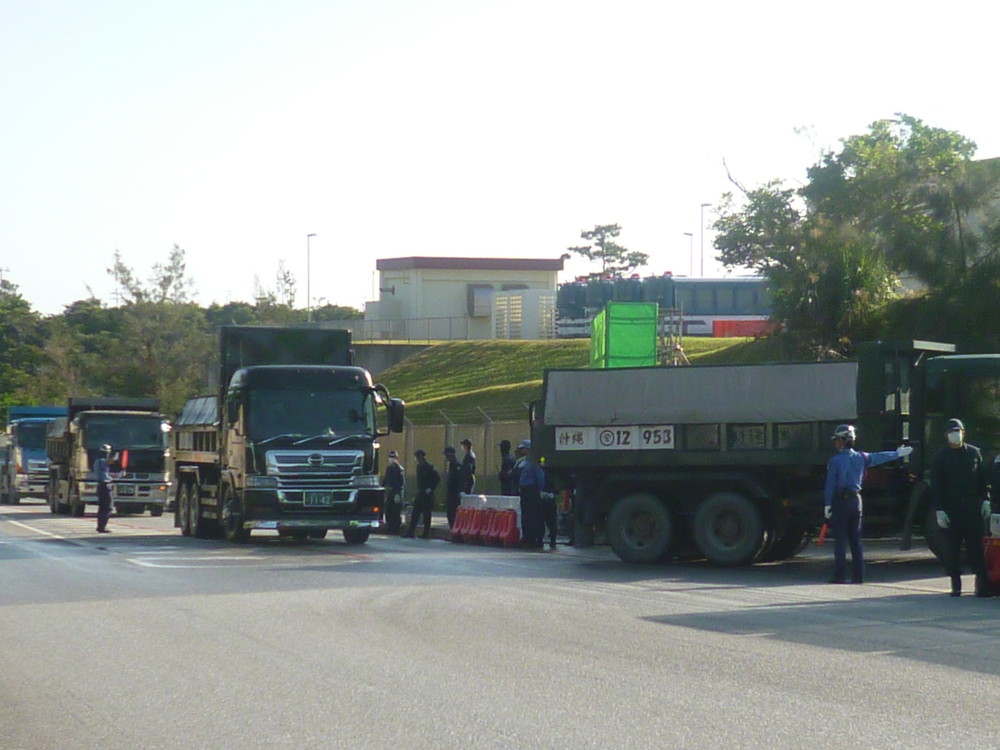 9時過ぎには、座り込みの人数を上回る機動隊によって、わずか十数分で排除され、50台余りのダンプやミキサー車が基地の中へ入っていった。