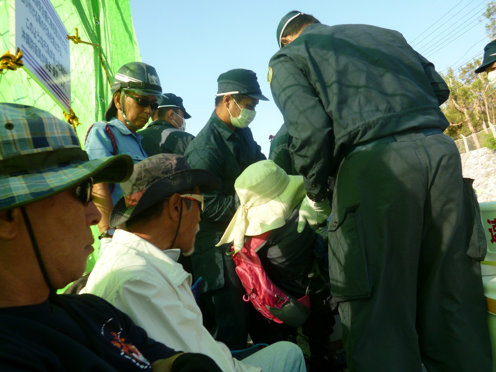 12時前の2回目の搬入には、那覇からのバスや、大阪からの参加者で50人余に増え、米国の若者らも一緒にゲート前に座り込んだ。