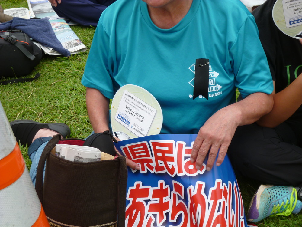 大会のテーマカラーは辺野古の青い海を象徴する「辺野古ブルー」。翁長知事の急逝で「喪服に変えては」という声もあったが、「会場が黒一色に染まることは、翁長知事も望んではいないはず。辺野古ブルーのテーマカラーはそのままに、喪章や黒いリボンなどで哀悼の意を表現しよう」ということになった。人々は思い思いの方法で気持ちを表現した。