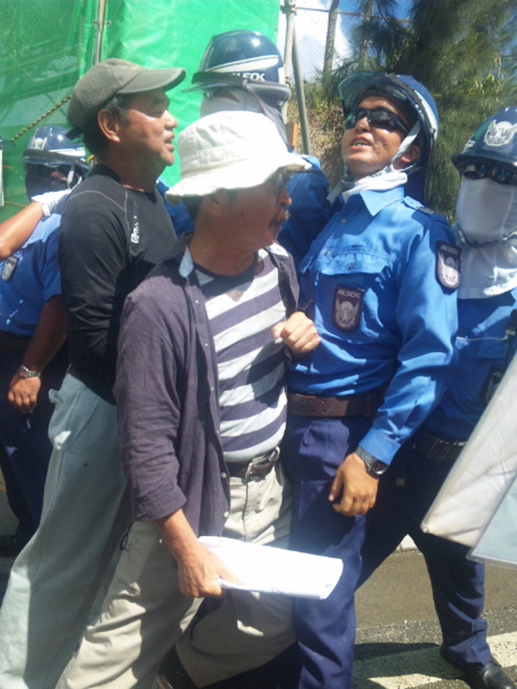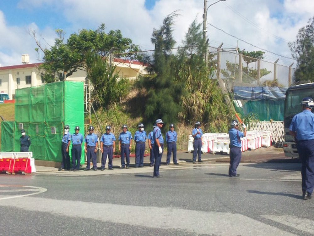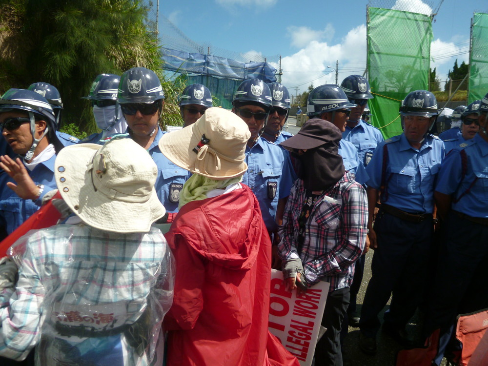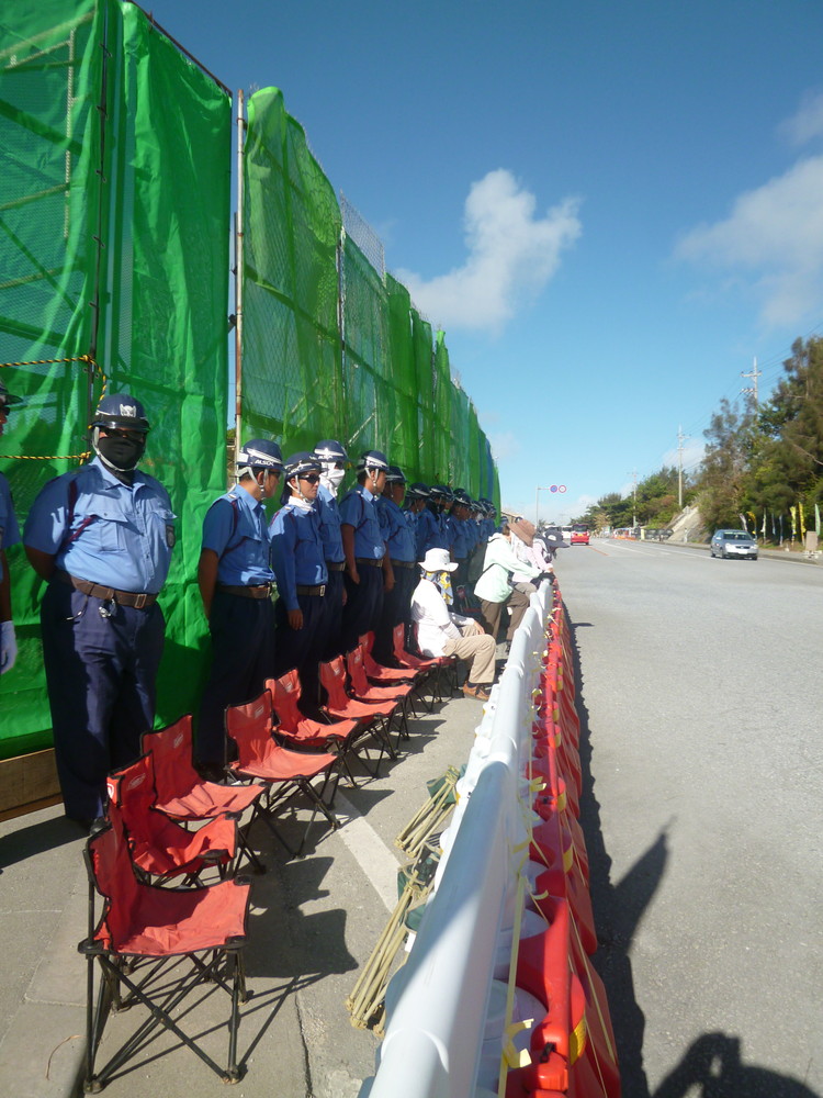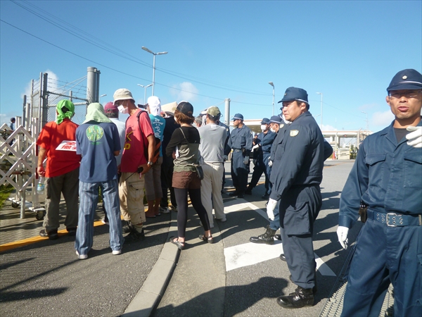 ゲート前に着くと、メインゲートが騒々しい。どうやら、工事用ゲートの新しい柵によって、抗議の場を奪われたことに怒った人たちが、ゲートから出てくる軍車両を止める抗議行動に出たようだ。機動隊がいなければ、わずか5~6名でも簡単に車は止めることができるのだ。