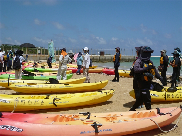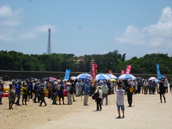 ゲート前で座り込み・県民集会が行われていた同じ時刻、海ではカヌーや抗議船およそ100隻を繰り出して工事に抗議する「海上座り込み大行動」が行われた。ゲート前の県民集会の後、ゲート前と海上行動が合流して、辺野古の浜で、連帯集会が開かれた。