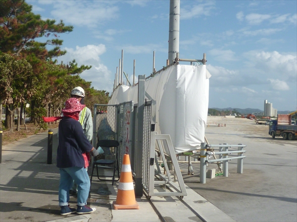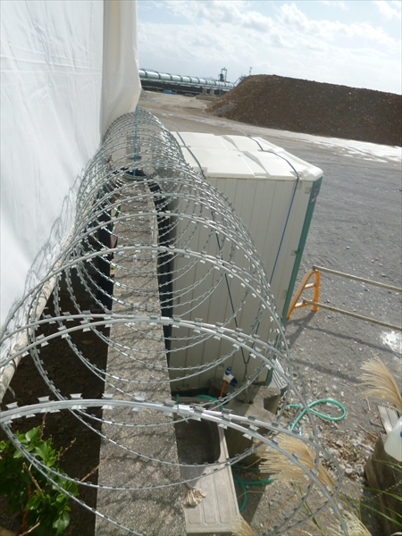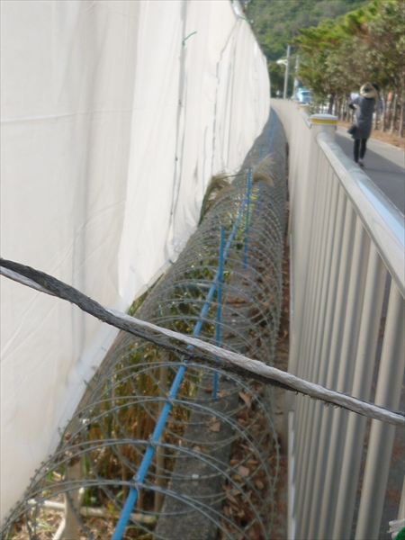 市民の抗議を見越して、セメントの塀や、白いテント幕で視界が遮られ、柵との間には有刺鉄線が張り巡らされていた。