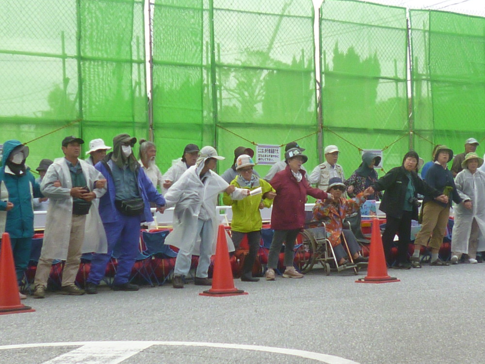 防衛局の職員数名が港の中へ入ろうとするのを阻止しようと、ゲート前で押し合いになった。20分ほど押し合い圧し合いの後、2度に分けて十数名が入った。