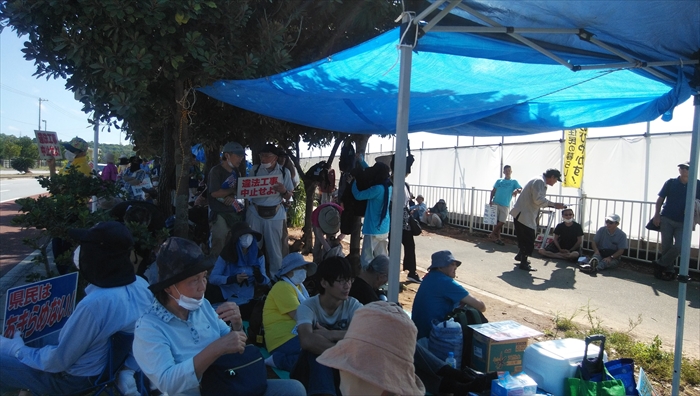 安和では、たくさんの人たちが、木陰で太陽を避けながら集会が続けられていた。県外から駆け付けた大勢の人たちが、次々とあいさつした。