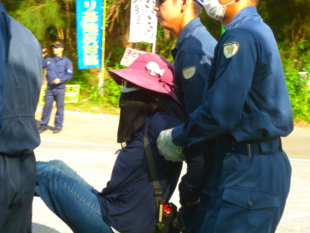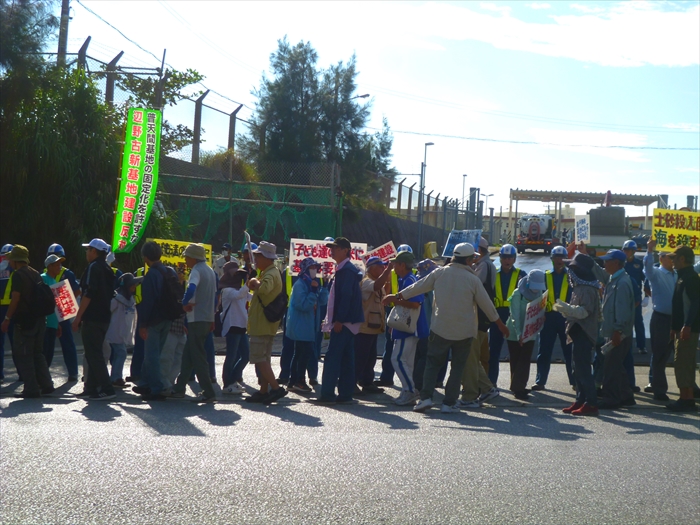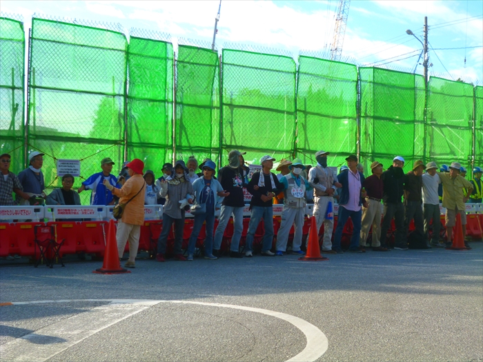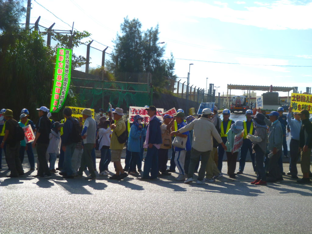台風や、先週の安和集中行動などでここ3週間、陸でも海でもほとんど作業が進んでいない。その分を取り戻そうということか、今週は、塩川でも安和でも、ここ辺野古ゲート前でも、大量の土砂や資材が強引に運ばれているとのこと。