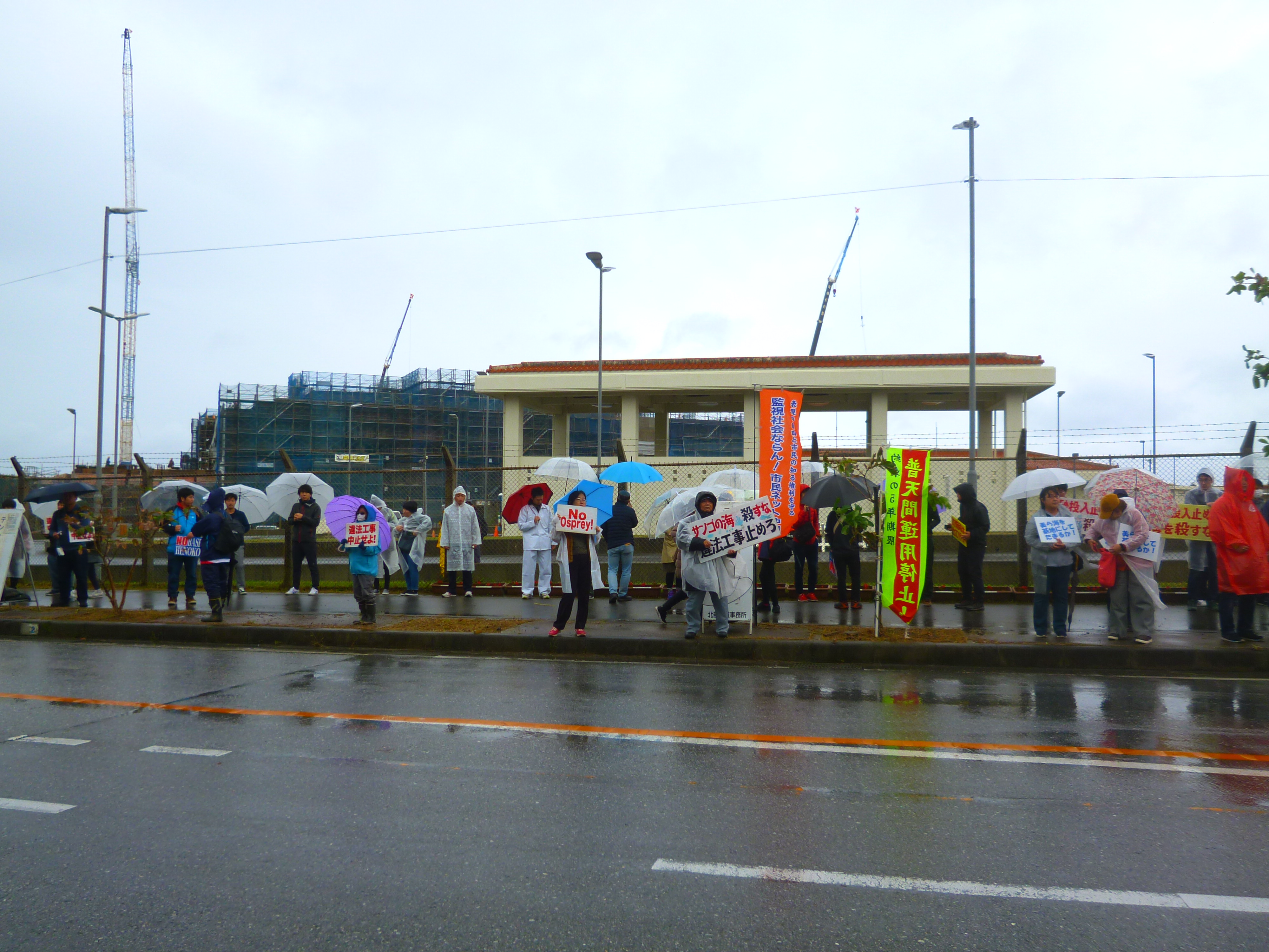 那覇を午前8時に出発、9時35分安和に到着すると、すでにカヌーが次々と結集していた。集会までにはまだ間があるので、ゲート前での抗議行動に参加。いつもは桟橋構内で控えている機動隊が、今日は前面にでて、規制を始めていた。