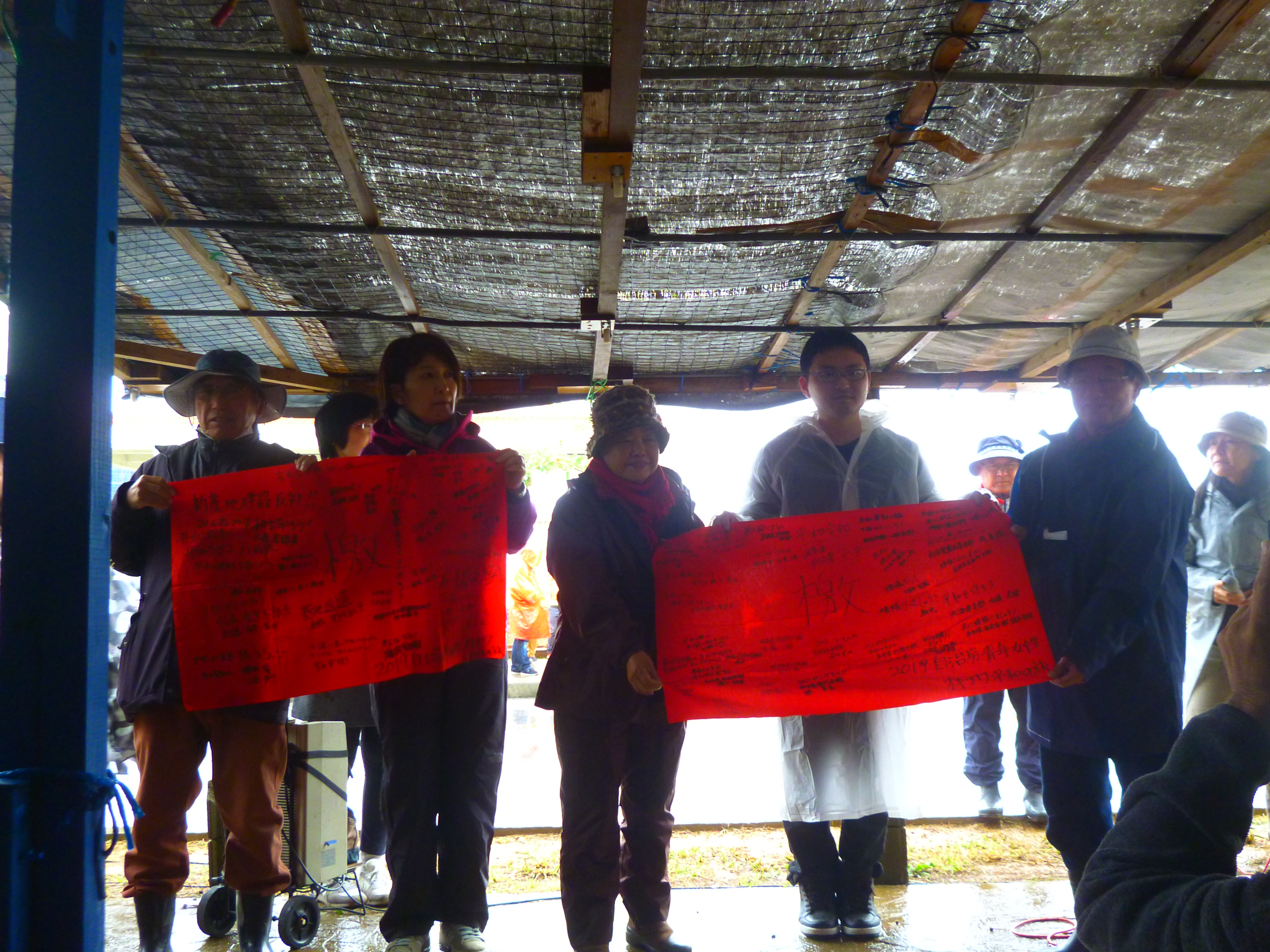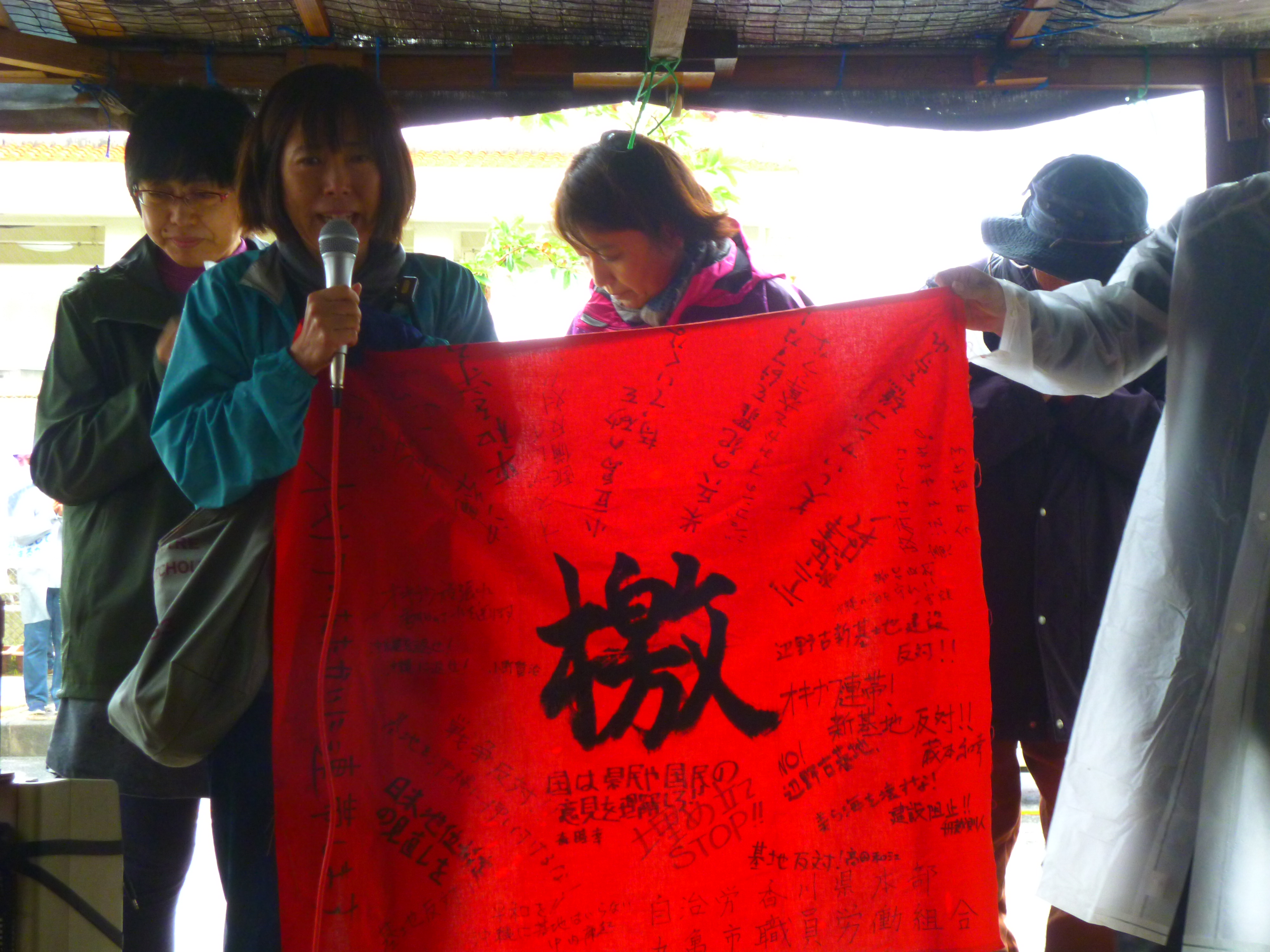 韓国から参加した若者たち。「非暴力で米軍基地に反対して何十年も抵抗を続ける辺野古の闘いは、同じように軍事基地に反対する韓国やアジアの人たちを勇気づけている。共に頑張りましょう!」と、持参した寄せ書きを、オール沖縄会議共同代表の高里鈴代さんに手渡した。
