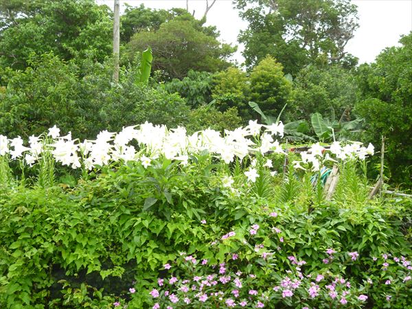辺野古集落の入り口に群生するテッポウユリ(ひめゆり)。ピンクの日日草とのコントラストがなんとも言えない。