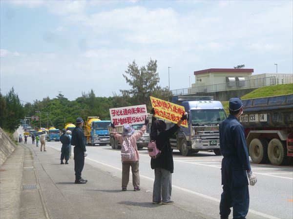 (3)1回⽬(8:30)、 2 回 ⽬( 11:30)、3回 ⽬( 14:30)とも、最初の座り込みのみとし、ダンプ等搬⼊⾞両の2グループ⽬が到着まで⾏っているデモンストレーションは、コール等による⾶沫防⽌のため、とりやめとします。 ※ゲート向かい側の歩道等での⾏動等⼯夫します。メッセージボードなど利⽤。