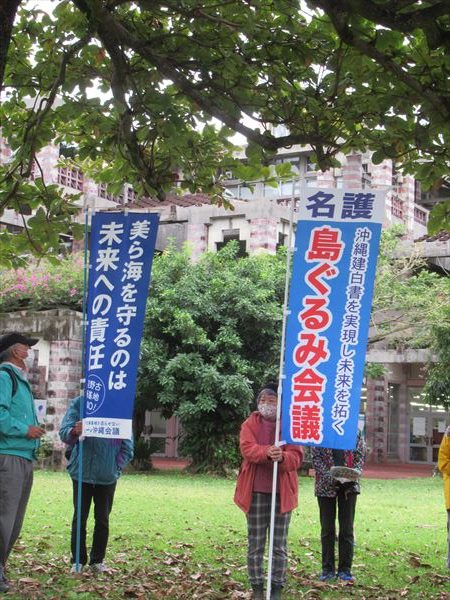 今日は、一回目の座り込みの後、那覇から2台のバスで参加の平和市民連絡会のメンバーは、正午過ぎから行われる名護市長への抗議集会へ参加の予定。