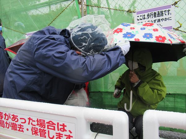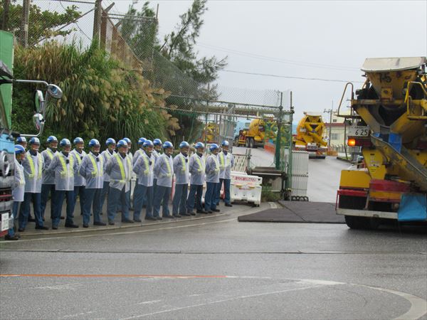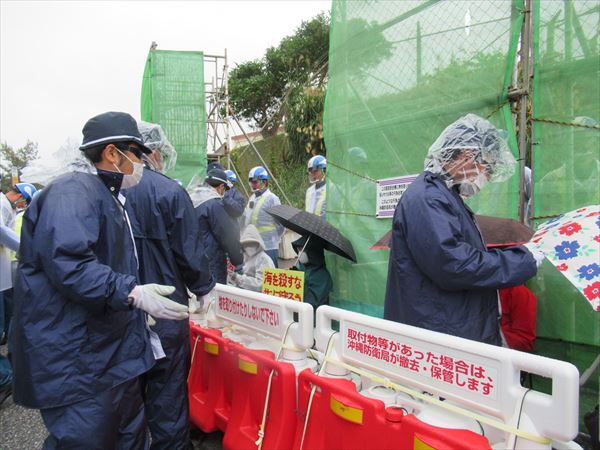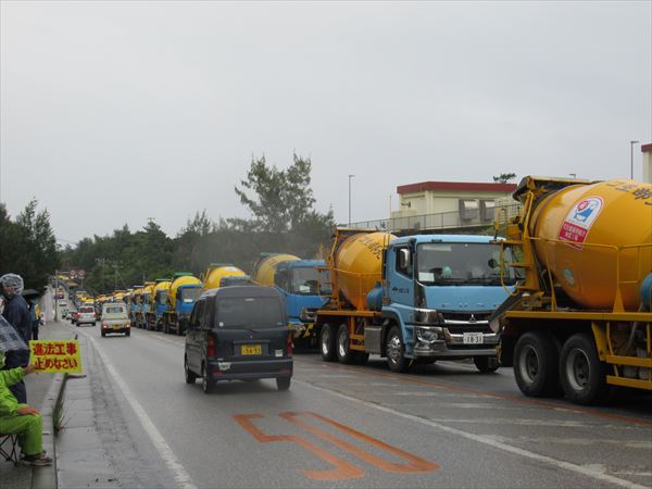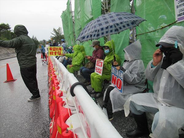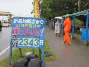 朝から小雨が降り続く中、いつもの通り7:00に那覇を出ました。出発間もなく天候不良のため安和や本部・塩川港での作業はないということがわかり、辺野古ゲート前へ合流することになりました。