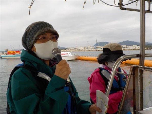 抗議船からは、いつもゲート前で「辺野古抵抗の歌」を歌いみんなを元気づける私たちの仲間が、抗議の歌声を響かせた。