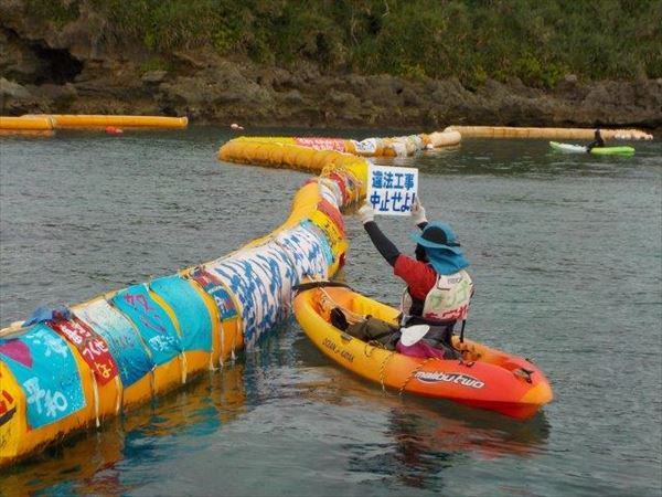 高速で走りまわる海保のゴムボートに追いかけまわされながら、プラカードやバナーを掲げ必死に、新基地反対を訴える一人乗りの小さなカヌー。カヌーが転覆するのも構わず、ゴムボートからカヌーに飛び移る海保。無謀、危険極まりない。