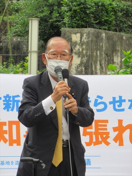 沖縄.県選出国会議員団を代表して照屋寛徳衆議員は「辺野古・大浦湾は、私たちうちなぁんちゅの魂。私たちは四方を海に囲まれて生かされてきた。その命の海に、海兵隊がイクサをするためだけの新基地を造らせてはいけない。県民みんなでデニー知事を支えて一緒に頑張りましょう!」.とあいさつ。
