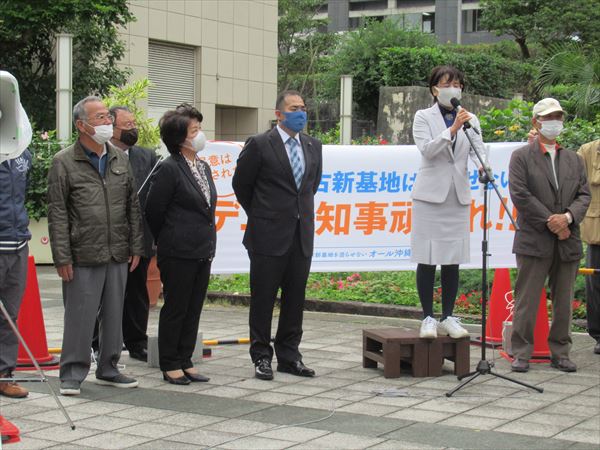 県議会与党の各会派代表がそれぞれ挨拶、デニー知事を支えて闘い抜く決意を表明した。
