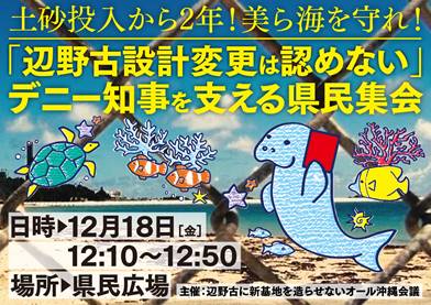 辺野古新基地を造らせないオール沖縄会議は、今日(12月18日)県庁前の県民広場で、土砂搬入から2年!美ら海守れ!「辺野古設計変更は認めない」デニー知事を支える県民集会を開催、小雨の中、250人が結集した。