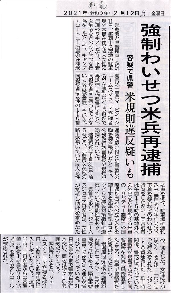 またもや米海兵隊員による女性への性暴力事件が発生しました。被害女性の通報により駆けつけた警察官を突き飛ばしたとして、公務執行妨害で逮捕・拘束されていたキャンプ・コートニー所属の海兵隊員が、去る12日、強制わいせつの容疑で再逮捕されたことで、事件が明らかになりました。