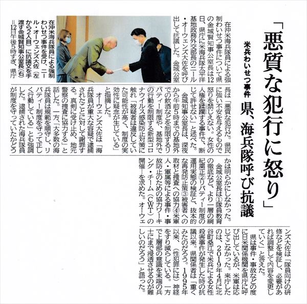 沖縄では、2016年のうるま市における元海兵隊員による20歳の女性殺害事件や、19年の北谷町での米海軍兵士による女性殺害事件の記憶もいまだ生々しく、被害に遭った女性にとって、屈強な米兵士に抑え込まれ、強引に身体に触られることがいかに恐怖か、想像を絶するものがあります。しかも、昨年からのコロナ禍にあって、在沖米軍では、兵士の勤務時間外の基地外での行動を制限しており、容疑者の米兵は事件の発生時間と、当時酒に酔っていたことから、行動指針に違反していたとみられます。