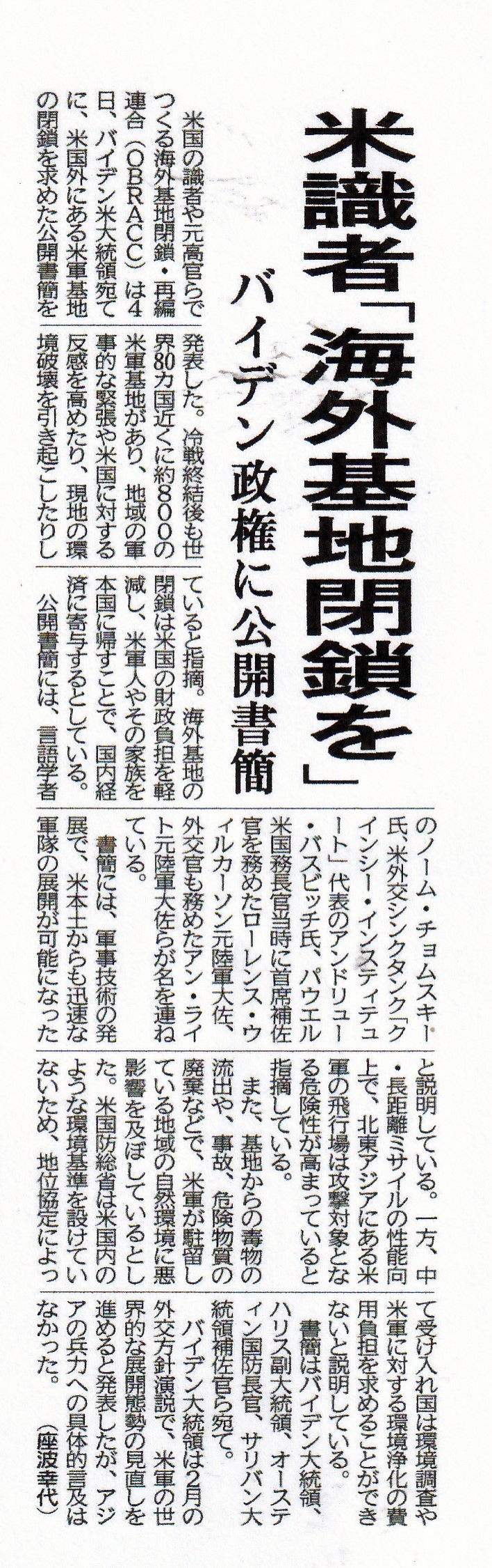 この記事は、米国内にも海外の米軍基地を閉鎖すべきだと考える人達がいることを伝えている。