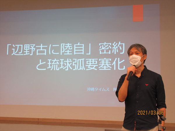 沖縄タイムスと共同通信の連携取材で、『辺野古新基地建設は米軍のためではなく、いずれ自衛隊の日本版「海兵隊」が常駐するのが目的』という、衝撃的な日米の密約を暴いた沖縄タイムス安倍岳記者の講演とあって、会場はコロナ禍の人数制限にも拘わらず満杯状態。会場に入り切れなかった一部の人は、レジメを見ながら、廊下で音声のみを聞くという状況で、県民の関心の高さを示した。