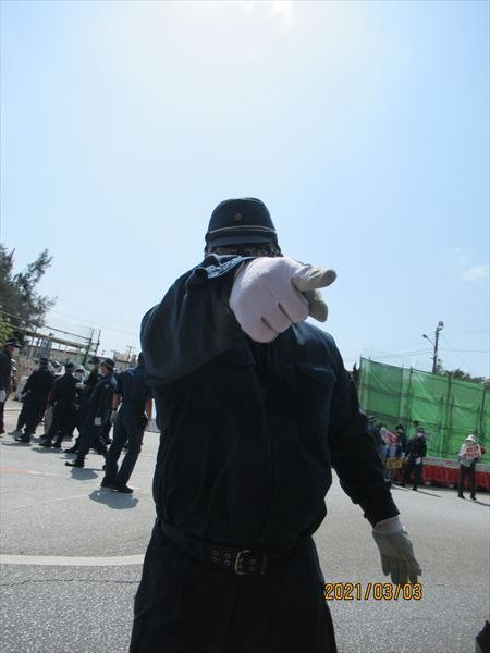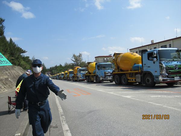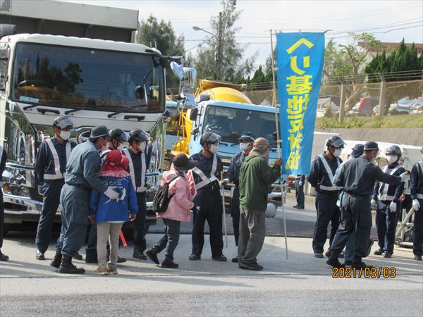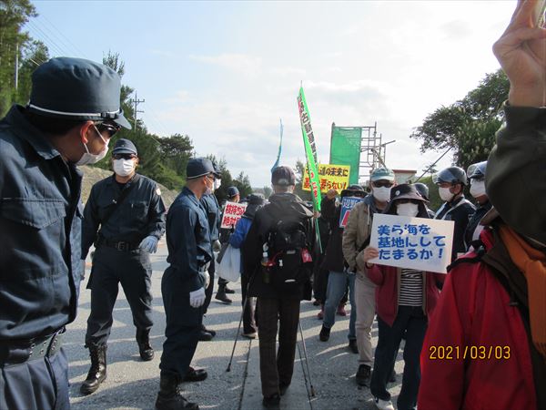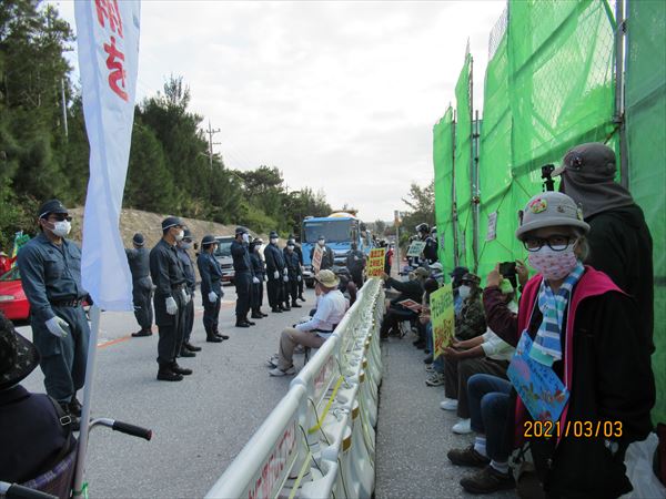 搬入の工事車両が途切れ、私たちがゲート前をデモ行進する間も、民間警備員と挟み撃ちのように威圧的な規制をした。