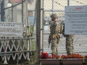 テントに戻る途中のメインゲートに戦闘服の米兵が3人、ゲートの両脇で機関銃を構え警戒していた。基地の中で何かあったのだろうか?