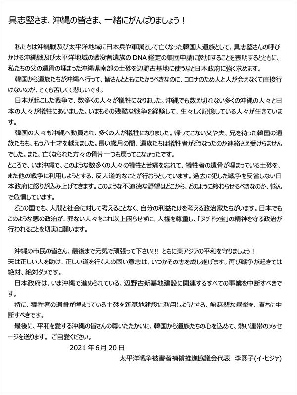 同じく沖縄戦で親族を失った韓国の遺族からのメッセージも届いている。